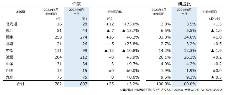 最も増加率が高かったのは『北海道』(前年同月16件→28件、75.0%増)で、10カ月ぶりに75%以上の増加率となった。次いで、『北陸』(同21件→26件、23.8%増)は7カ月連続で20件を超え、前年同月を上回った。