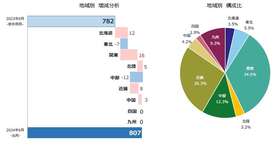地域別にみると、9地域中5地域で前年同月を上回った。最も増加率が高かったのは『北海道』(前年同月16件→28件、75.0%増)で、10カ月ぶりに75%以上の増加率となった。『北陸』(同21件→26件、23.8%増)は7カ月連続で20件を超え、前年同月を上回った