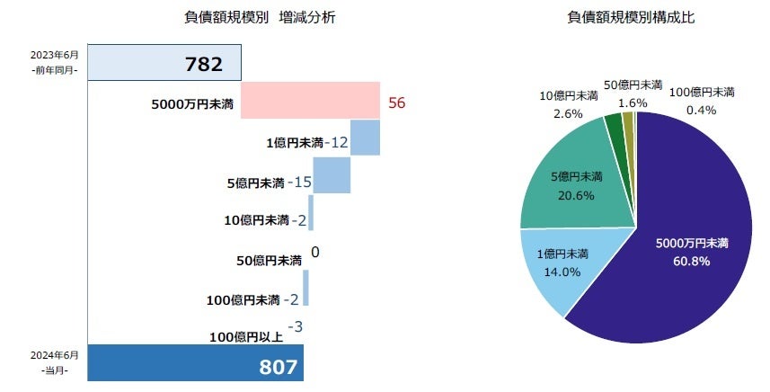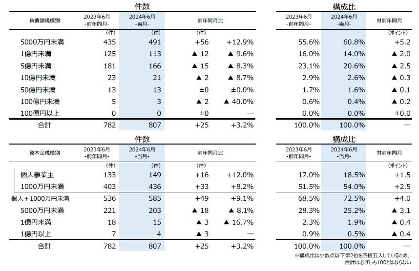 規模別にみると、負債「5000万円未満」(491件)が最多。資本金『個人+1000万円未満』(585件)は全体の72.5%を占め、過去2番目の規模となった