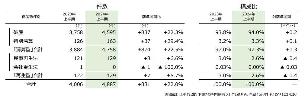 倒産態様別にみると、『清算型』倒産の合計は793件(前年同月751件、5.6%増)となり、全体の98.3%(対前年同月2.3ポイント増)を占めた。『再生型』倒産は14件(同31件、54.8%減)にとどまり、6カ月ぶりに10件台となった。
