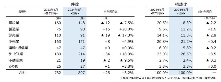業種別にみると、7業種中3業種で前年同月を上回った。『サービス業』(前年同月180件→214件、18.9%増)が最も多く、『小売業』(同163件→171件、4.9%増)、『建設業』(同160件→148件、7.5%減)が続いた。『サービス業』は、2000年以降で初めて4カ月連続で200件を上回った。増加率でみると、『製造業』(同75件→90件、20.0%増)が最も高かった。