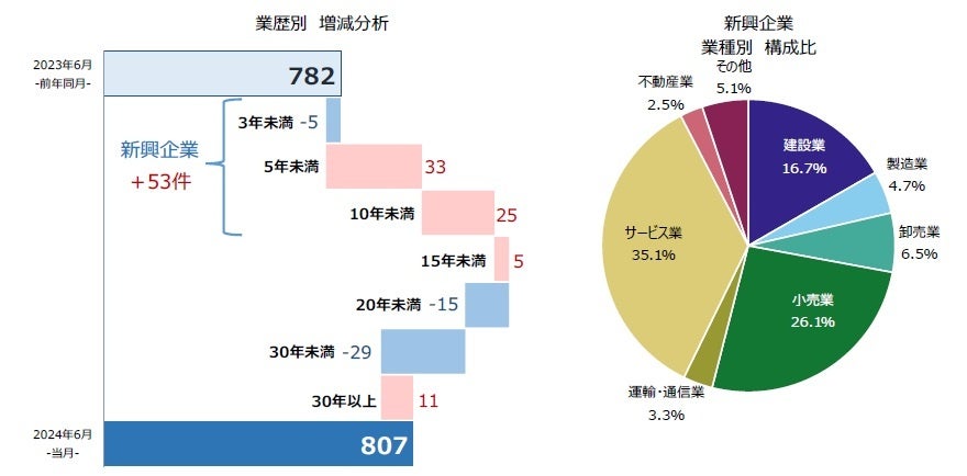 業歴10年未満の『新興企業』[「3年未満」(前年同月39件→34件、12.8%減)、「5年未満」(同46件→79件、71.7%増)、「10年未満」(同138件→163件、18.1%増)]は276件(前年同月223件、23.8%増)となり、9カ月連続で200件を超えた。内訳を業種別にみると、「サービス業」(同66件→97件、47.0%増)が最も多く、2000年以降で最多を更新。「小売業」(同43件→72件、67.4%増)、「建設業」(同49件→46件、6.1%減)が続いた。