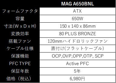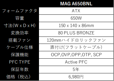 製品URL:https://jp.msi.com/Power-Supply/MAG-A650BNL