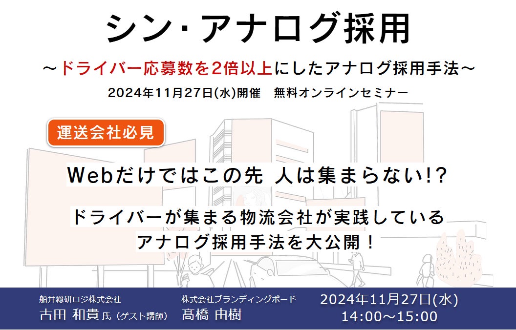 「シン・アナログ採用~ドライバー応募数を2倍以上にしたアナログ採用手法~(主催:株式会社ブランディングボード様)」に船井総研ロジの経営コンサルタントが登壇