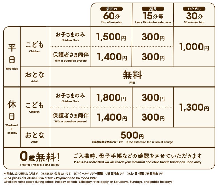 ご利用料金:0歳のお子さま無料/保護者さまは平日無料