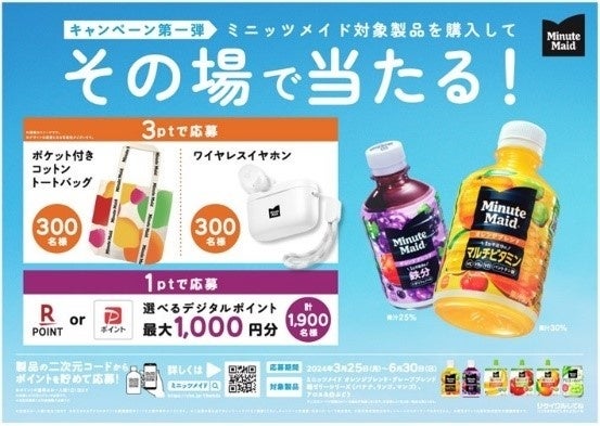 3月25日(月)から約1年間にわたり、第1弾から4弾まで各期2,500名様に抽選でプレゼントが当たるマイレージキャンペーンを実施します。キャンペーン第1弾ではポケット付きコットントートバッグや、ワイヤレスイヤホンなどの「ミニッツメイド」オリジナルグッズのほか、最大1,000円分のデジタルポイントをラインナップしました。