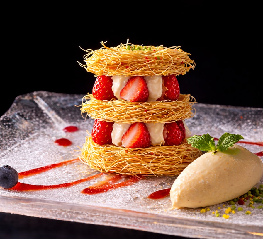 さらに2004年のオープン当初から提供する人気デザート『ジョエル・ロブションのミルフィーユ ~天使の髪をつむいで~』を、“とちあいか”を使った新作としてご用意いたします。香ばしく焼き上げたカダイフに“とちあいか”と、マスカルポーネと生クリームの軽やかなクリームを重ねました。サクサクの生地と苺、コクのあるクリームの調和をお楽しみいただけます。是非この機会に期間限定デザートをお楽しみください。
