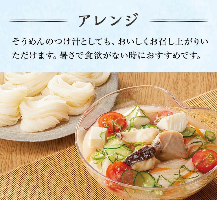 しょうがの風味を感じるスッキリとした冷たい鯛だしに、キュウリ、トマト、オクラなどお好みの野菜を加えるだけでサッと完成。暑い夏場でも火を使わず手軽に調理できます。お好みでミョウガ、大葉などの薬味を足すと爽やかな香りや食感を感じられ食欲をそそります。