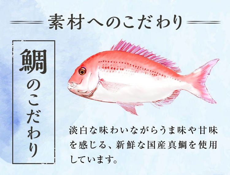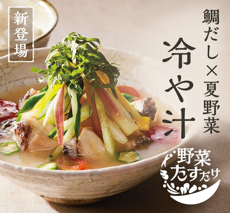 「冷や汁」は、農家が夏の重労働を行う際、時間や食欲のない時でも充分な栄養補給や体力回復のために、簡単に食べられる生活の知恵として伝承されてきた郷土料理です。「野菜たすだけ 鯛だしで食べる国産真鯛の冷や汁」は、調味済みのため、ご自宅にある野菜や豆腐と合わせるだけで、火を通す必要もなく、手軽にお召し上がりいただける初夏の蒸し暑い時期にぴったりのタイパメニューです。