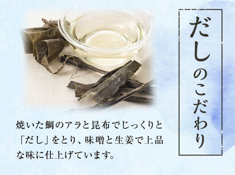 出汁のベースとなるのは、骨が大きく太いため、魚体の半分以上が未利用部位となってしまう真鯛です。今回は、その真鯛のアラを焼いて臭みを取り除いてから、昆布とともに煮だし出汁にすることで、上品な味わいに仕上げています。また、味噌には生姜も入り、食欲を刺激します。
