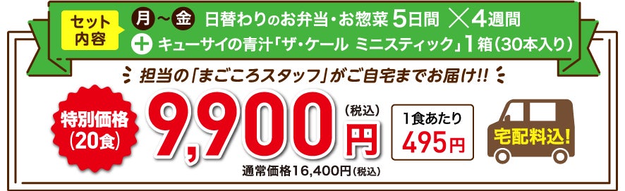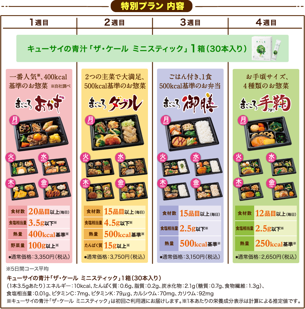 ・対象商品:1週目「まごころおかず」、2週目「まごころダブル」、3週目「まごころ御膳」、4週目「まごころ手鞠」、キューサイの青汁「ザ・ケール ミニスティック」1箱(30本入り)のセット
