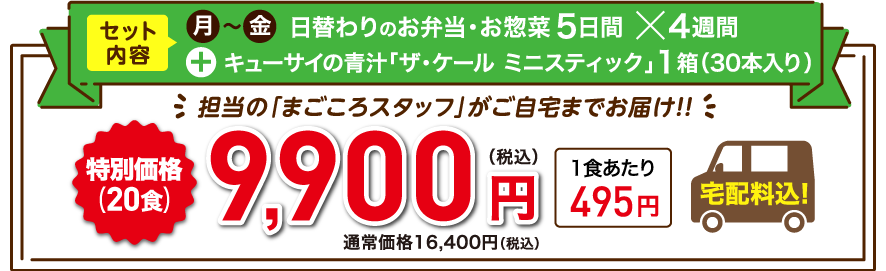 ※通常料金:16,400円 :日替わり5日間コース×4週分 12,900円(「まごころおかず」3,350円、「まごころダブル」3,750円、「まごころ御膳」3,150円、「まごころ手鞠」2,650円)+キューサイの青汁「ザ・ケール ミニスティック」1箱(30本入り)3,500円