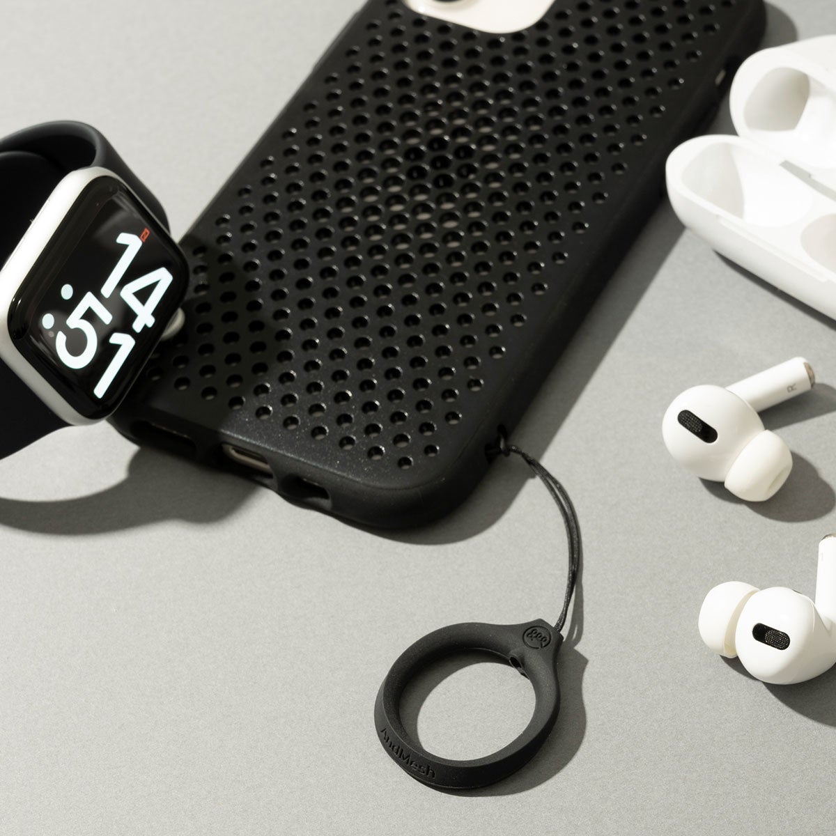 リングストラップに使われる素材は柔軟性に富んでいるため、フィット感に優れ指が疲れにくく、男性でもサイズ感を気にせず使いやすい設計です。カラーは、iPhoneケースで人気の高い「ブラック・クレイグリーン・ライトベージュ」と合わせた3色展開。AndMeshのiPhoneメッシュケースと合わせ使いで、統一感のあるコーディネートが完成します。