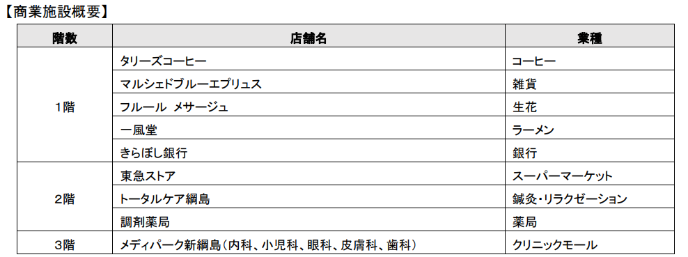 商業施設部分の1階には、「タリーズコーヒー」「一風堂」の飲食店と、生花店、銀行など計5店舗が出店し、2階には「東急ストア」、鍼灸・リラクゼーション、調剤薬局の3店舗が出店します。3階には、内科・小児科・眼科・皮膚科・歯科の5つの診療科があるクリニックモール「メディパーク新綱島」が出店し、地域の方々の生活を支えるサービスを提供します。