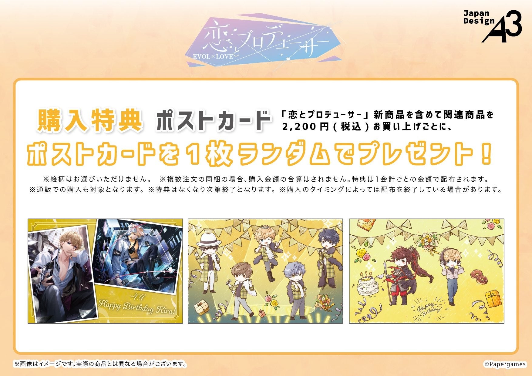 『恋とプロデューサー~EVOL×LOVE~』新商品を含めて関連商品を1会計2,200円(税込)お買い上げごとに、購入特典としてポストカードをランダムで1枚プレゼント!