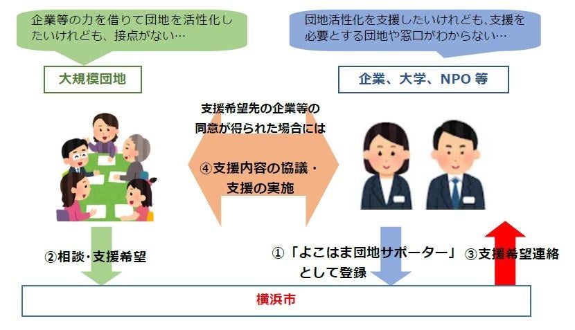 横浜市は、大規模団地の再生・活性化のため「よこはま団地サポーター制度」を創設します。制度開始にあたり、4月18日(月)から6月30日(木)まで、「よこはま団地サポーター」として登録して頂ける企業、大学、NPO等の初回募集を行います。
