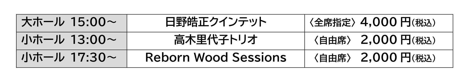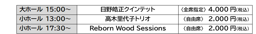 日野皓正クインテット、高木里代子トリオ、Reborn Wood Sessions、