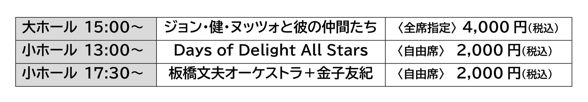 ジョン・健・ヌッツォと彼の仲間たち、Days of Delight All Stars、板橋文夫オーケストラ+金子友紀、