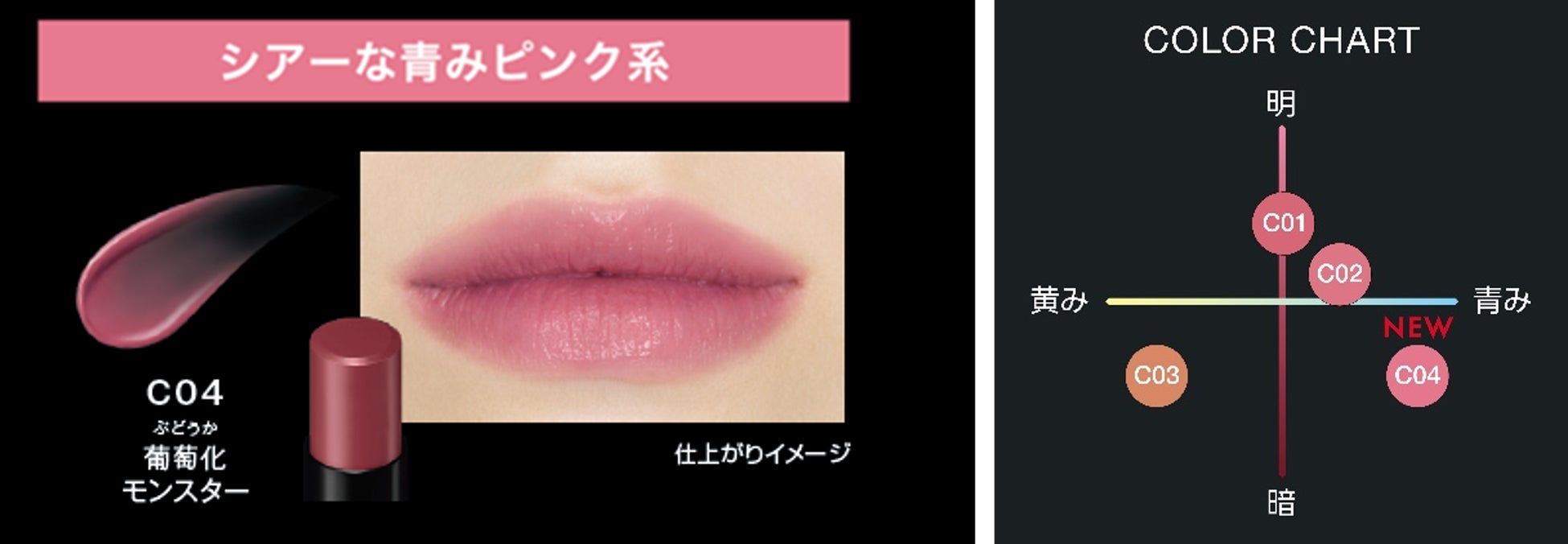 「リップモンスター クリアトーン」は、発色を抑えたなじみ発色カラーが唇の色と同化するようになじみ、くすみを補整しながら自然な血色感を演出します。今回発売する新色は、透明感を引き立てるシアーな青みピンク系のカラーです。