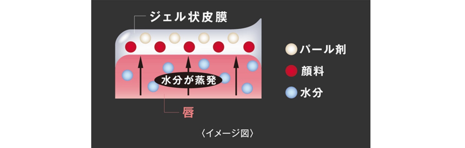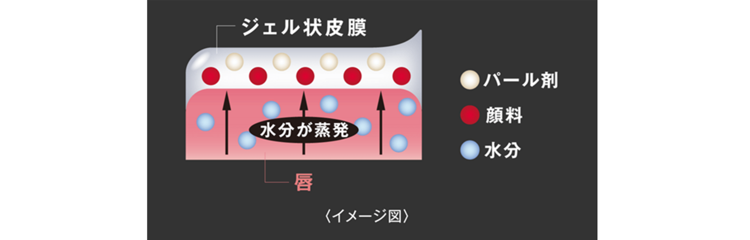 ①唇から蒸発する水分を活用して密着ジェル膜へと変化。つけたての色が長時間持続します。