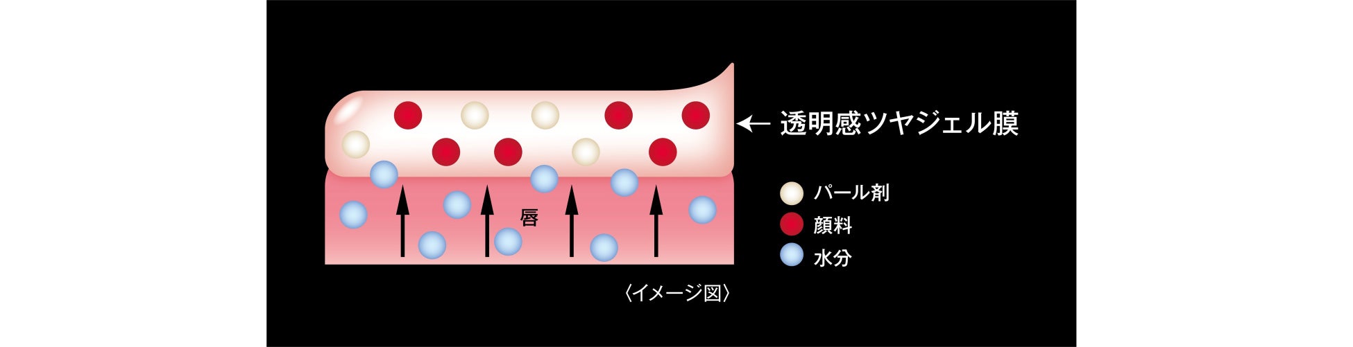 ①唇から蒸発する水分を活用し、密着ジェル膜に変化する独自技術*¹により長時間の色持ちを実現。