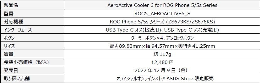 ASUS JAPANは、ペルチェ素子搭載の外付け冷却ユニット「AeroActive Cooler 6 for ROG Phone 5/5s Series」を発表しました。「AeroActive Cooler 6 for ROG Phone 5/5s Series」は、発売以降大変好評いただいているROG Phone 6シリーズ専用外付け冷却ユニット「AeroActive Cooler 6」のROG Phone 5シリーズ専用版となります。「AeroActive Cooler 6 for ROG Phone 5/5s Series」は、12月9日(金)より公式オンラインストアASUS Storeにて販売を開始いたします。
