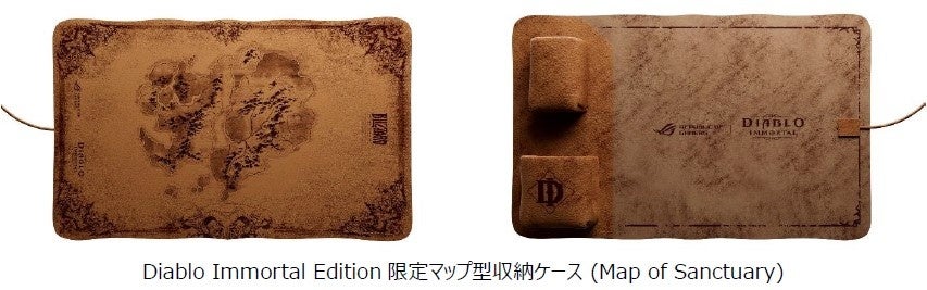 「ROG Phone 6 Diablo Immortal Edition」では、ROG Phone 6の高性能はそのままで、本体カラーにヘルファイアレッドを採用した本体には恐怖の帝ディアブロのデザインを施しました。さらには限定のテーマパックが利用可能で、Diablo Immortalをテーマにした壁紙や着信アニメーションなどのUIデザインでゲームの世界観を楽しむことができます。付属品にはDiablo Immortal Edition限定SIMイジェクトピン (Immortality Ejector Pin)やDiablo Immortal Edition限定Aero Case (Shield Blessing)、Diablo Immortal Edition限定マップ型収納ケース (Map of Sanctuary)、そしてDiablo Immortal Edition限定UVライト (Fahir’s Light)といったアクセサリーも同梱されており、Diablo Immortalファン必見のディティールが詰め込まれた製品となっています。Diablo Immortal Edition限定Aero Caseと、Diablo Immortal Edition限定マップ型収納ケースは、付属のDiablo Immortal Edition限定UVライトで照らすと一部が光る仕様となっています。Diablo Immortal Edition限定マップ型収納ケースに浮かび上がる英語版特設サイトのURLにアクセスすると、購入者限定特典の獲得方法を確認することができます。