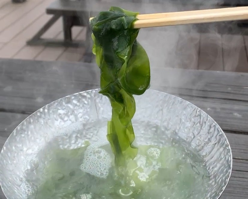海水を沸騰させた大鍋でわかめを湯通ししてから、たっぷりの塩をもみ込むことで塩分を抜いていきます。体験後のわかめはお土産に。生わかめのしゃぶしゃぶ試食付き。