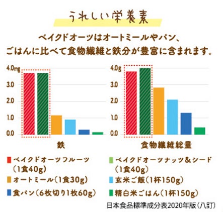 ●食物繊維と鉄分をたっぷりとることができます。また、一般社団法人「食・楽・健康協会」よりロカボ(適正糖質※6)商品として認定されており、『ベイクドオーツ フルーツ』は1食40g当たり糖質量24.1g、『ベイクドオーツ ナッツ&シード』は1食40g当たり糖質量21.1gとロカボライフにもぴったりです。