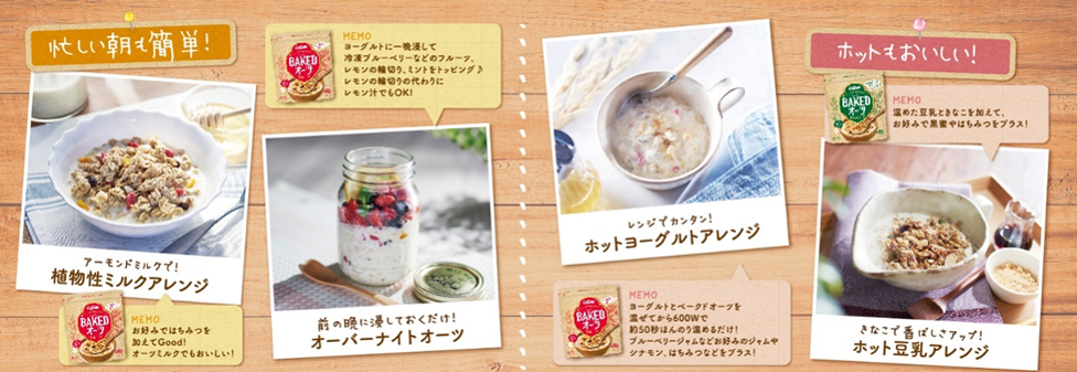 こうした結果を踏まえ、“簡単おいしいオートミール”を目指して開発。穀物としてオーツ麦だけを使うベイクドオーツは、複数穀物を焼き上げるグラノーラとは異なり焼き方や工程に工夫が必要でしたが、カルビーがこれまで培った技術やノウハウを生かし、おいしく焼き上げるベイクド製法(※4)に行き着きました。オーツ麦やフルーツ、ナッツの素材そのままのおいしさを生かした、加熱調理不要でミルクやヨーグルトをかけるだけで簡単に食べられる新ジャンルのオートミール加工品です。オートミールに興味のある方や、従来のオートミールが続かなかった方に、お試しいただきたい商品です。