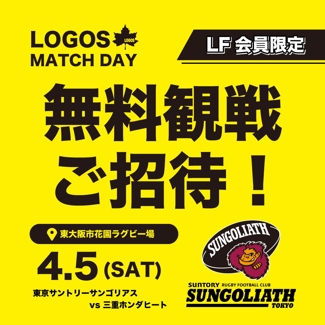 株式会社ロゴスコーポレーション(本社:大阪市住之江区、代表取締役社長:柴田茂樹)は、2025年4月5日(土)に東大阪市花園ラグビー場にて行われる東京サントリーサンゴリアスホストゲーム(NTTジャパンラグビー リーグワン2024-25 ディビジョン第14節 東京サントリーサンゴリアス vs 三重ホンダヒート)のマッチデー協賛をし、「ロゴスマッチデー」として開催いたします。