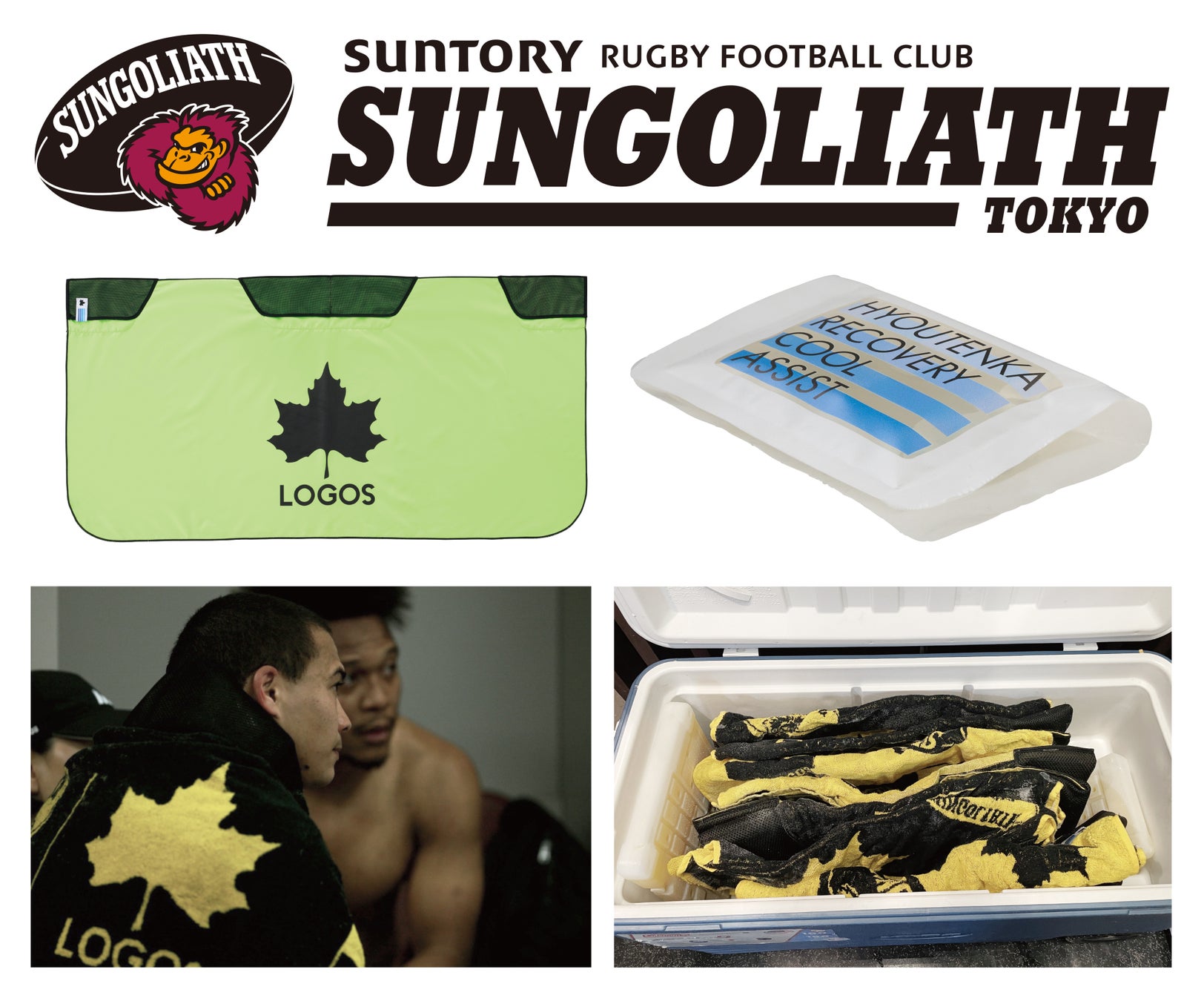「氷点下リカバリー・クールボディタオル」「氷点下リカバリー・クールアシスト」のプロ仕様モデルは、ラグビーチーム「東京サントリーサンゴリアス」と共同開発し、試合のクールダウンで選手のみなさまにご使用いただきました。