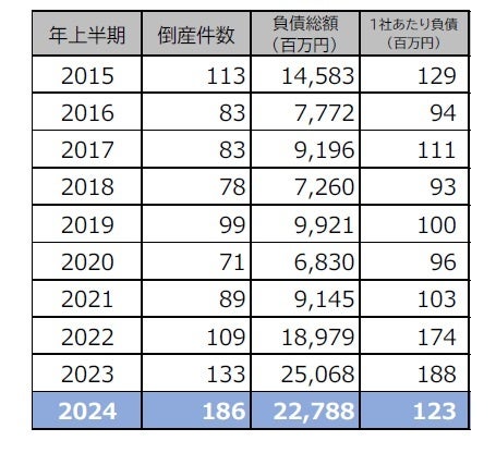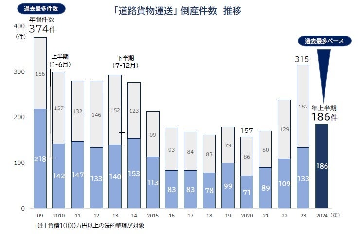 2024年上半期(1-6月)の道路貨物運送業者の倒産件数は186件。前年同期(133件)から39.8%増となり、4年連続で増加した。上半期としては2009年(218件)に次ぐ2番目となり、このままのペースで推移すると年間最多となった2009年(374件)を上回る可能性がある。