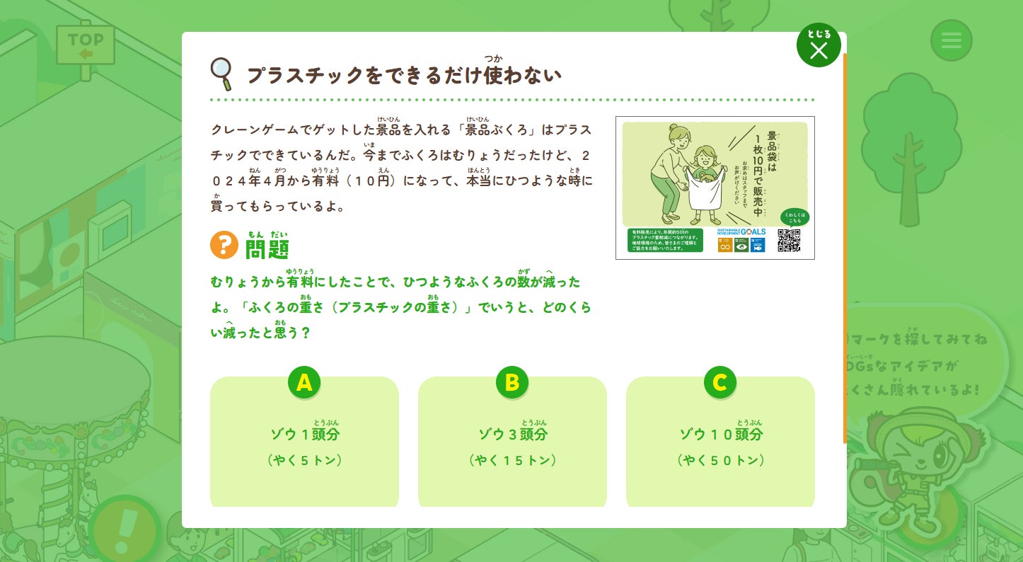 ●クレーンゲームやスキッズガーデンがミニチュアのようで可愛らしいと思いました。2人の子どもがスマホを取り合いになりながらマップをさわって遊んでいたので、面白いサイトだと思いました。まだ漢字が読めませんが、ふりがながふってあったので、頑張って読んでクイズにも挑戦していました。(未就学児の保護者さま)