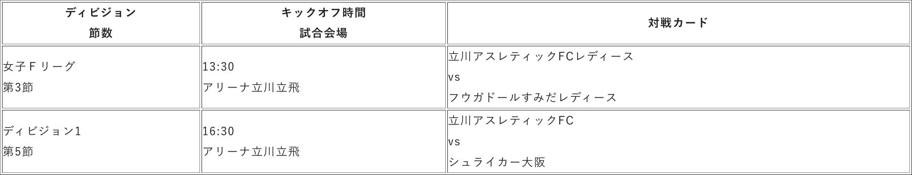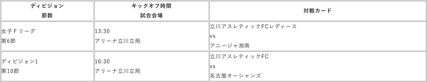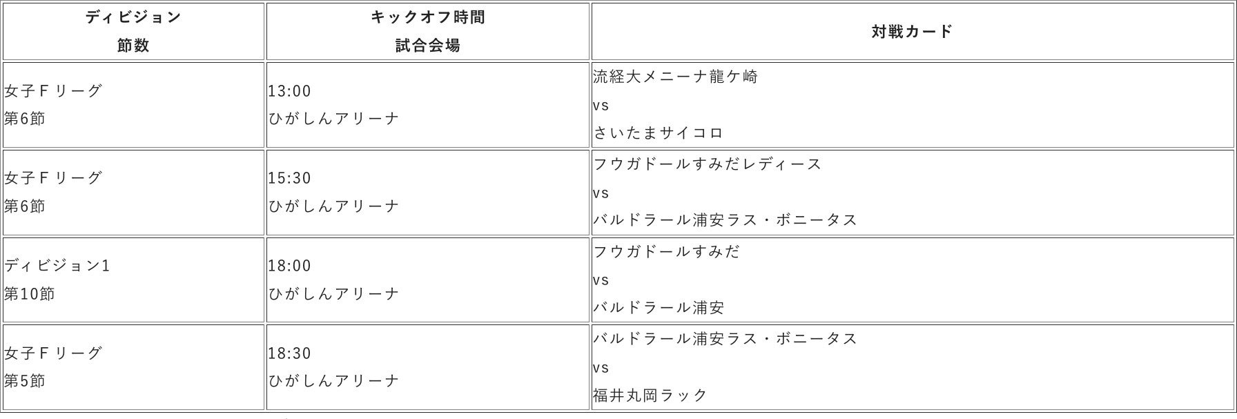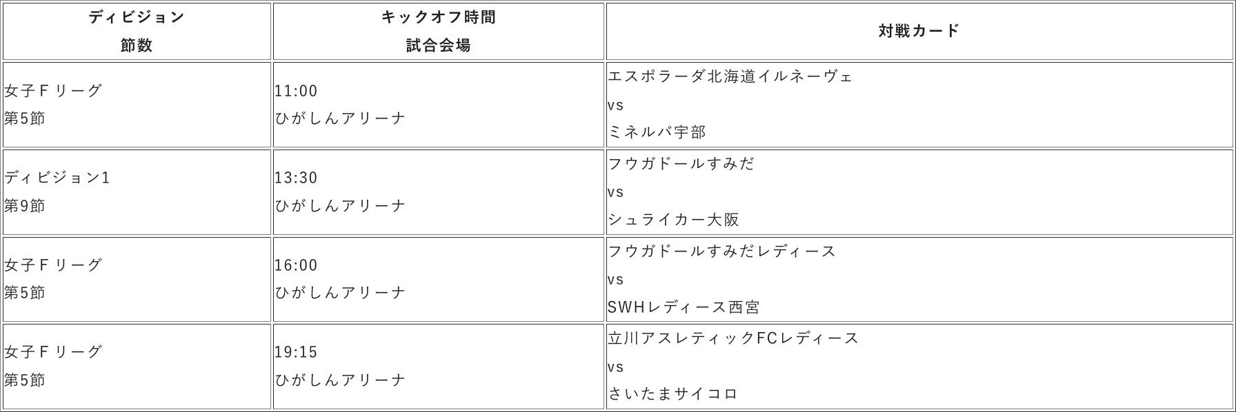 今シーズンのレギュラーシーズンでは、「立川アスレティックFC」「立川アスレティックFCレディース」による男女共同開催が6月28日(土)・8月3日(日)に「アリーナ立川立飛」で、「フウガドールすみだ」「フウガドールすみだレディース」による男女共同開催が7月26日(土)・8月2日(土)に「ひがしんアリーナ」で、それぞれ行われます。