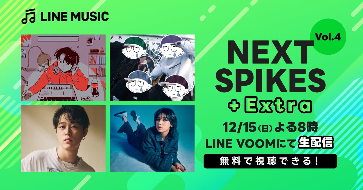 LINE MUSIC株式会社は、LINE MUSICの次世代アーティストパワープッシュ企画「NEXT SPIKES Vol.4」より選出された第四弾アーティスト、AKASAKI、前髪ぱっつん少年、Baby Canta、Leinaらが出演する生配信を12月15日(日)に「LINE」内のショート動画プラットフォーム「LINE VOOM」にて配信します。