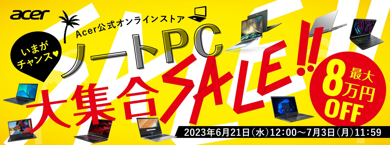 日本エイサー株式会社(本社:東京都新宿区、代表取締役社長:ボブ・セン)は、同社のパソコン、モニター、プロジェクター、ガジェット、空調家電の各種製品を取り扱うAcer 公式オンラインストアにて、本日2023年6月21日(水)午後12:00~7月3日(月)午前11:59の期間、ノートパソコンが対象の「いまがチャンス!ノートPC大集合セール」を実施します。高性能モバイルノートパソコン、スタンダードノートパソコン、ゲーミングノートパソコン、Chromebookなど、Acer/Predatorブランドの人気製品をお得にゲットするチャンスです。