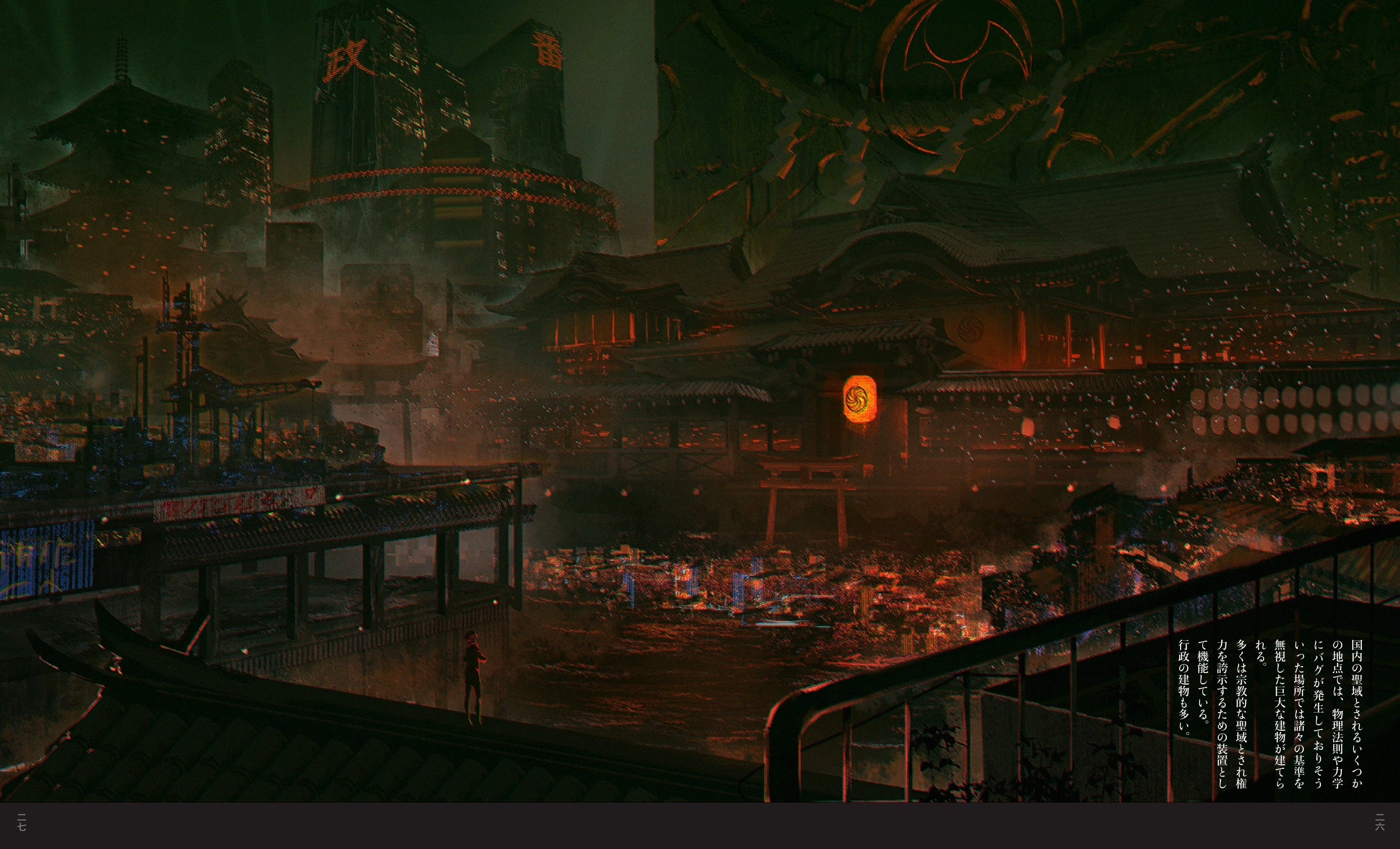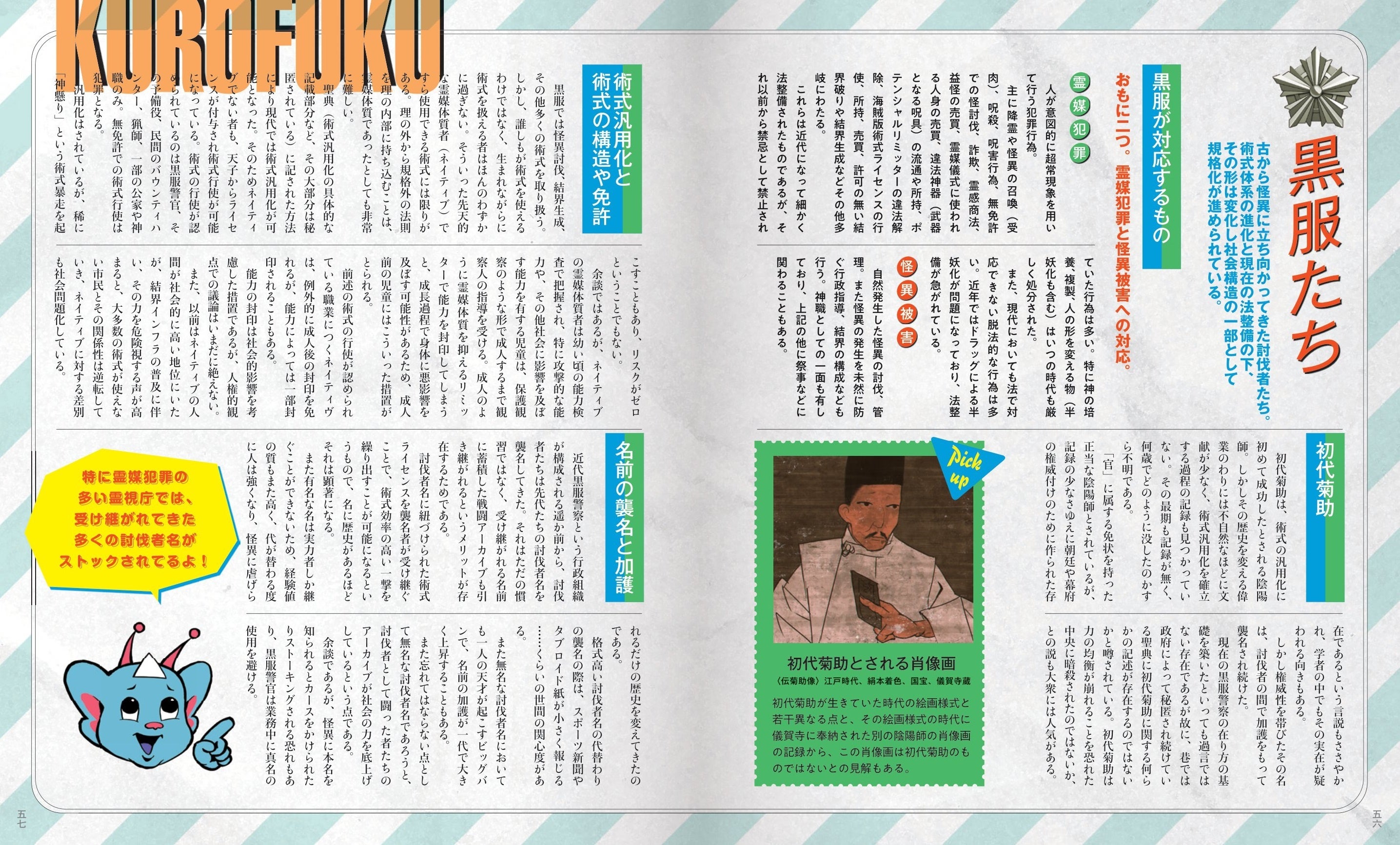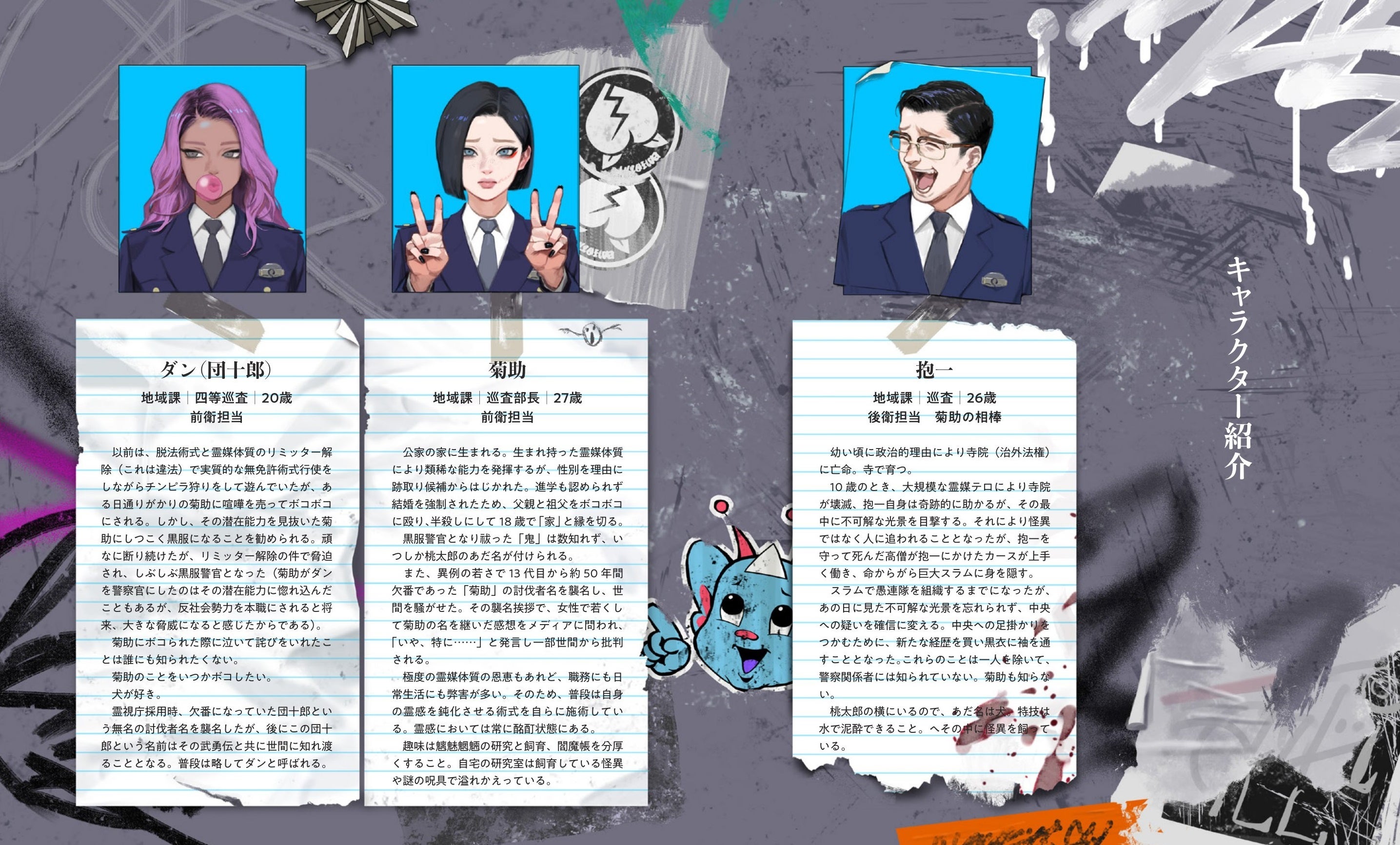 街のあちこちで討伐、調査、休憩など活動する黒服警官たちのほか、その封印や滅却から逃れる怪異の数々、そのどちらにも属さない民間陰陽師や社会的混乱を招く扇動者、僧兵を束ねるリーダーなど、今回はじめて明かされるその人物たちの詳細なプロフィールをはじめ、緻密な人物画も掲載する。