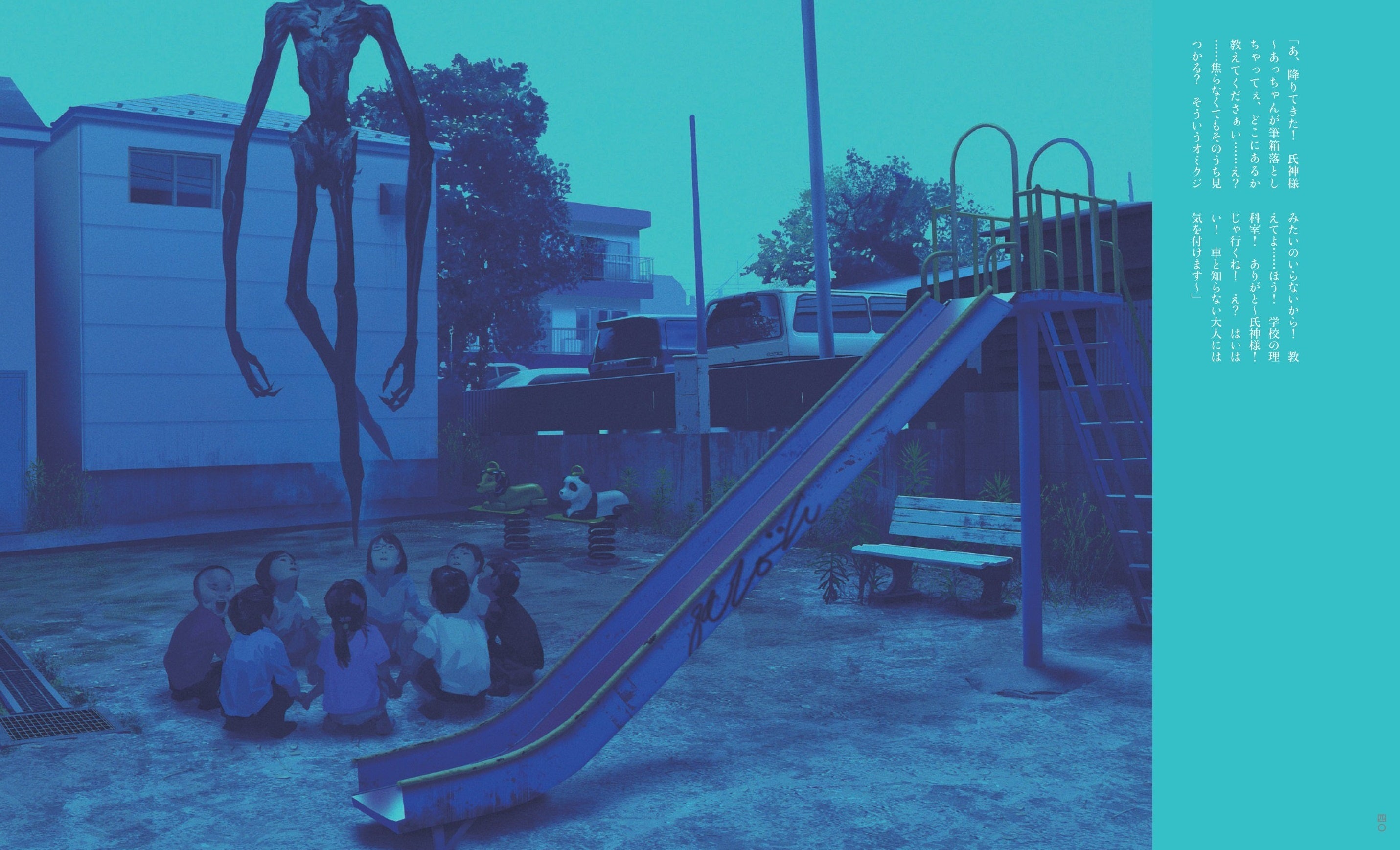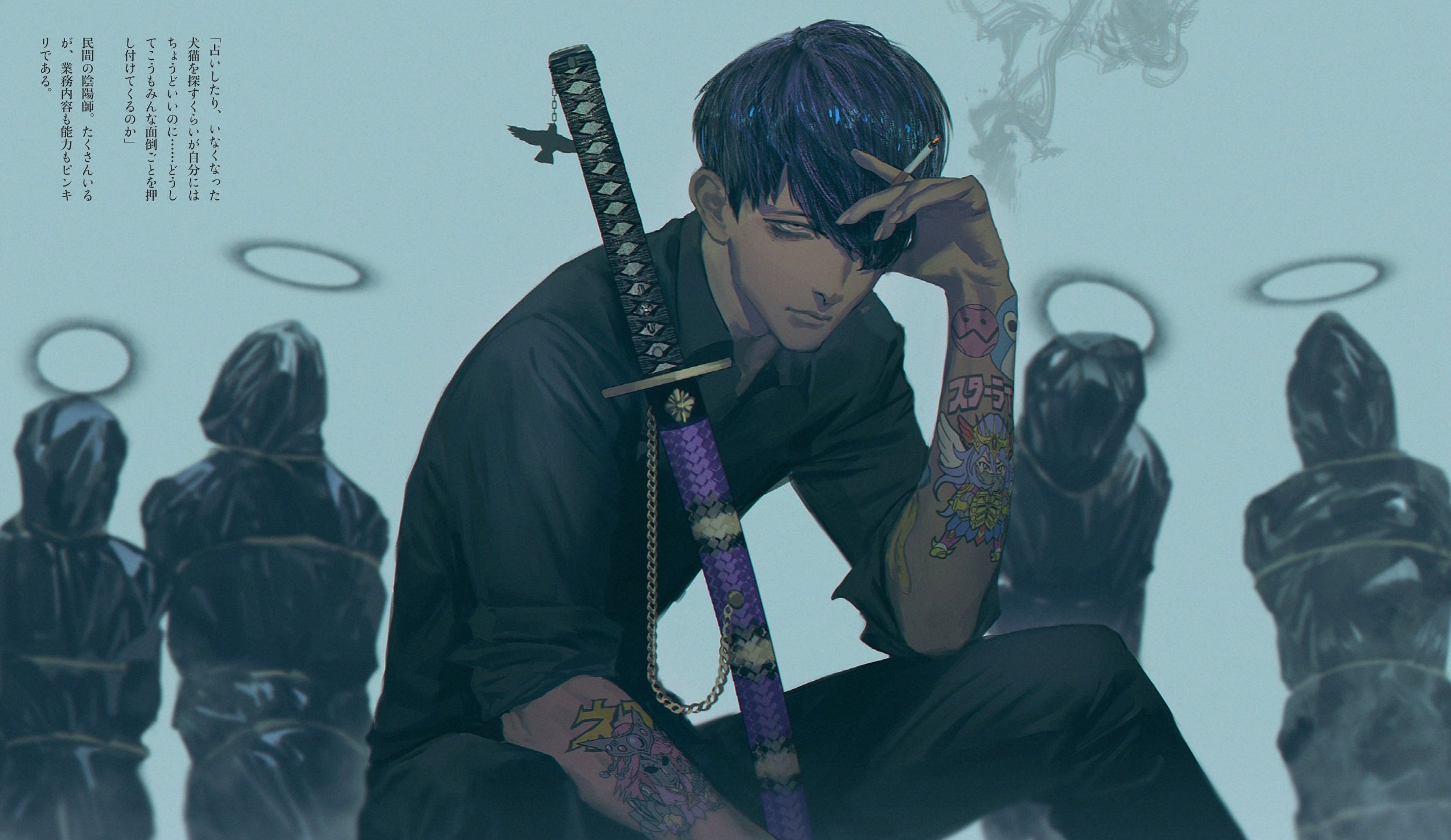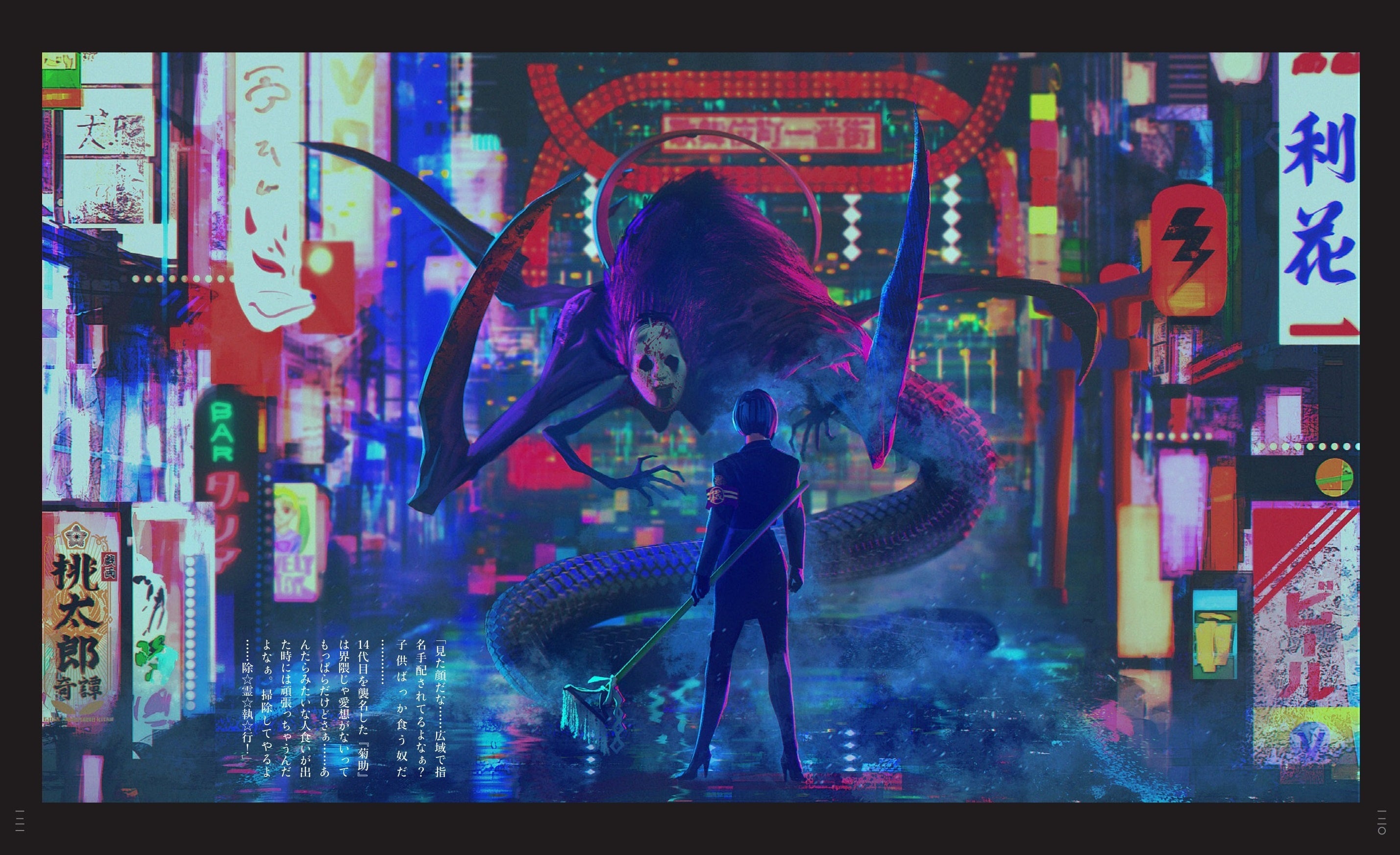 街のあちこちで討伐、調査、休憩など活動する黒服警官たちのほか、その封印や滅却から逃れる怪異の数々、そのどちらにも属さない民間陰陽師や社会的混乱を招く扇動者、僧兵を束ねるリーダーなど、今回はじめて明かされるその人物たちの詳細なプロフィールをはじめ、緻密な人物画も掲載する。