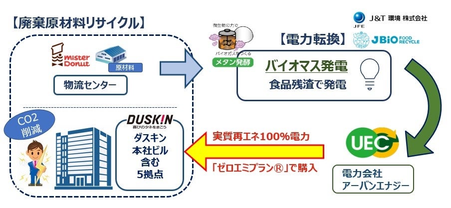 ダスキンでは、2021年に「ダスキン環境目標2030(DUSKIN Green Target 2030)」を策定し、脱炭素社会の実現に向けて、2030年度までに再生可能エネルギーの利用比率を50%にすることを目標に掲げています。この目標を達成するため、以前より再資源化の取り組みに協力いただいているJ&T環境株式会社の食品リサイクル工場や、その子会社である株式会社Jバイオフードリサイクルの施設などで食品残渣から微生物の働き(メタン発酵)によってバイオガスを発生させ、そのガスで発電した電力をアーバンエナジー経由で購入し当該施設で使用します。