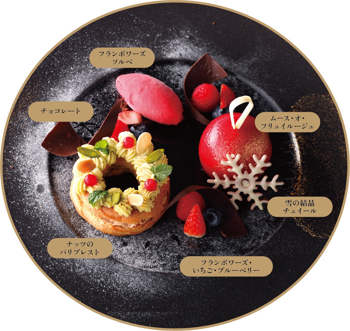 ベリーの甘酸っぱさとナッツの香ばしさがぎゅっと詰まった、クリスマス限定のスペシャルプレート。甘酸っぱいフランボワーズのソルベとともに、さまざまな味が楽しめます。まるでクリスマスプレゼントのような、心ときめくひと皿です。