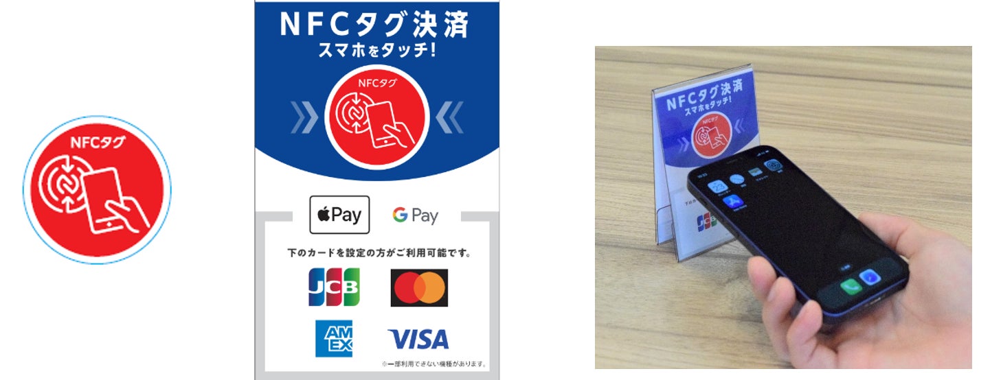 店頭に設置された NFC タグ(※1)に、お客様が自身のスマートフォンをかざすことで、WEB ブラウザが起動され、表示された画面からApple Pay またはGoogle Pay でスムーズに決済できるサービスです。