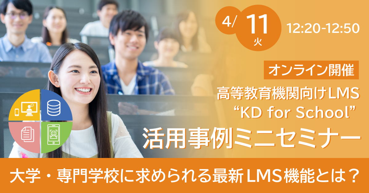 大学・専門学校に求められる最新LMS機能とは? “KD for School”活用事例ミニセミナー《3/17(金)・4/11(火)昼 オンライン開催》高等教育機関向けLMSをご紹介!