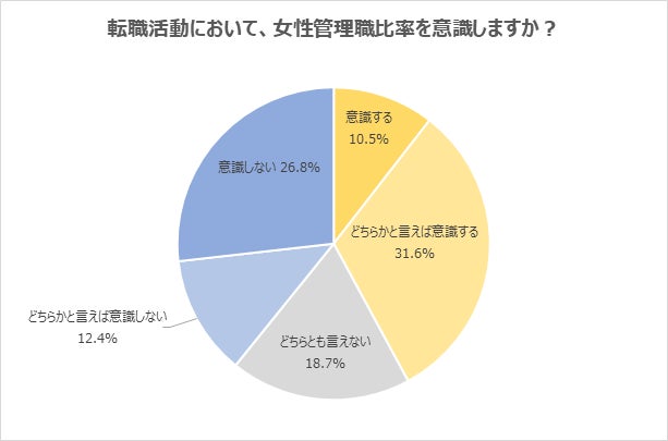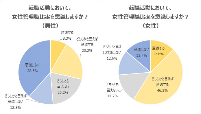 株式会社学情(本社:東京都千代田区)は、20代の仕事観をひも解くために、アンケート調査を実施しました。今回は、「女性管理職比率」に関して調査。女性管理職比率が高い企業について、「好感が持てる」と回答した20代が25.8%に上りました。「どちらかと言えば好感が持てる」43.5%を合わせると、約7割の20代が、女性管理職比率が高い企業に好感を持っていることが分かります。「時代の潮流に乗っている企業だと思う」「ダイバシティを重視している企業だと感じる」「社会課題に取り組む姿勢を感じる」「SDGsのなかでも、ジェンダーの平等には強い関心を持っている」などの声が寄せられました。また、4割超の20代が、転職活動において、女性管理職比率を意識するとしています。男女別では、「意識する」「どちらかと言えば意識する」と回答した割合が、男性は28.5%、女性は58.9%となりました。6割弱の20代女性が「意識する」としており、関心の高さが伺えます。