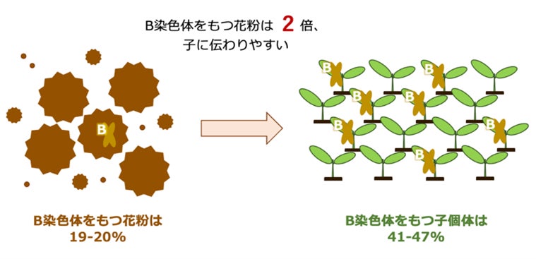 また、オスの生殖組織で起こる減数分裂や生産された花粉を観察したところ、B染色体を含む花粉の割合は 期待値の50%から19〜20%まで低下しておりました。ところが交配実験の結果では、興味深いことに、この親から41〜47%の子の個体にB染色体が伝達されておりました。このことは、花粉にとってホソバオケラB染色体の保有は、花粉間で起こる受精競争などに打ち勝つ武器になる可能性を示しています(図5)。オスとメスの両方の性からB染色体が優先的に伝達される仕組みは、これまでのB染色体の遺伝とは異なった、とてもユニークな生き残り戦略でした。