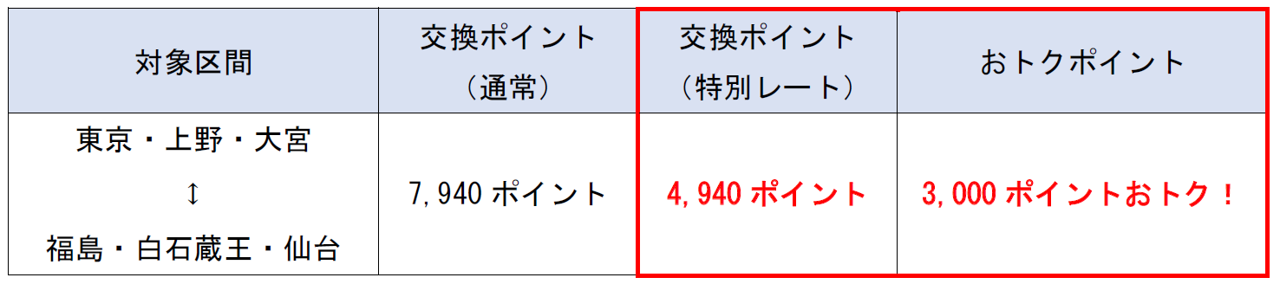 ○JR東日本では、JRE POINTを新幹線eチケットに交換できる「新幹線eチケット(JRE POINT特典)」の交換ポイント数を、仙台駅始発または終着の「やまびこ」号限定で、通常7,940ポイントのところ4,940ポイントで交換できるおトクな商品を発売します。 ○混雑を避けた少し遅めの夏休みのご旅行等に、様々なシーンで貯まるJRE POINTを使っておトクに東北新幹線をご利用ください。 |