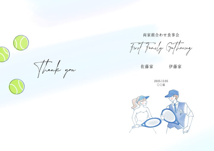 ラケットを手に並ぶふたりの姿が爽やかな一枚。息の合ったラリーのように、喜びも困難も一緒に乗り越えていく──そんな未来を描いたデザインです。