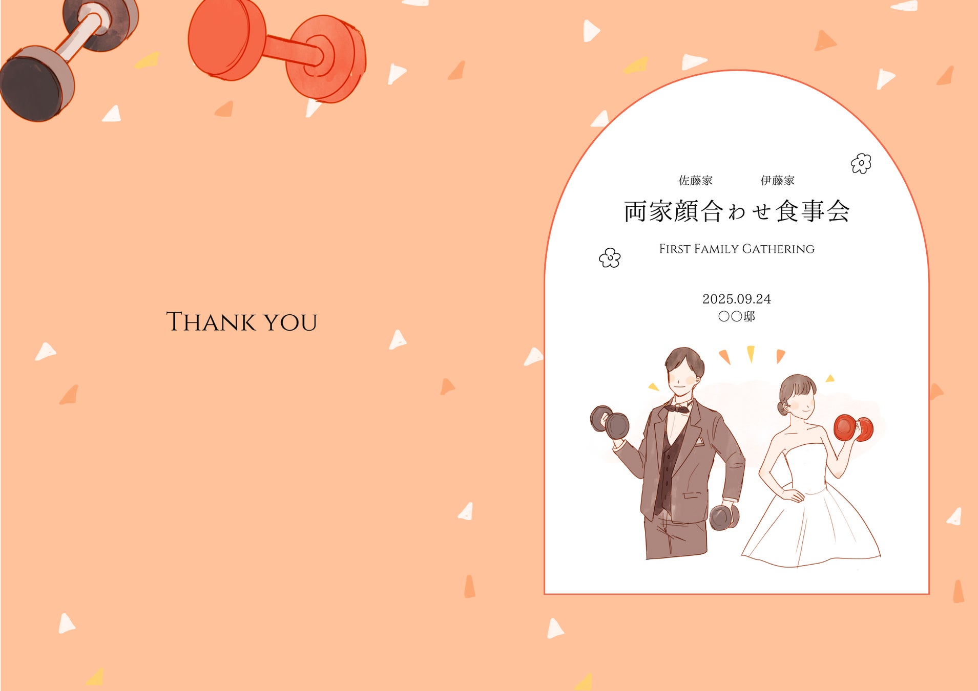 ダンベルを手に、息ぴったりでトレーニングするふたりを描いたデザイン。ユーモアの中にあるのは、支え合い・高め合う夫婦のかたち。