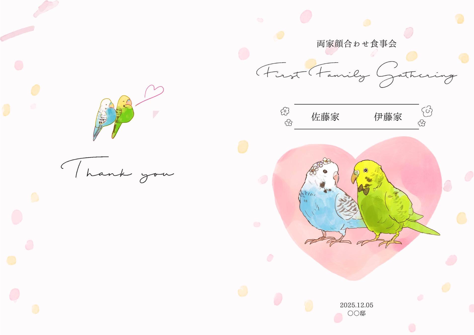 仲睦まじく寄り添う可愛らしいインコが描かれた、心温まるデザイン。「いつも一緒に、支え合いながら生きていく」--そんな夫婦の絆を象徴するインコたちが、ふたりの門出を優しく見守ります。