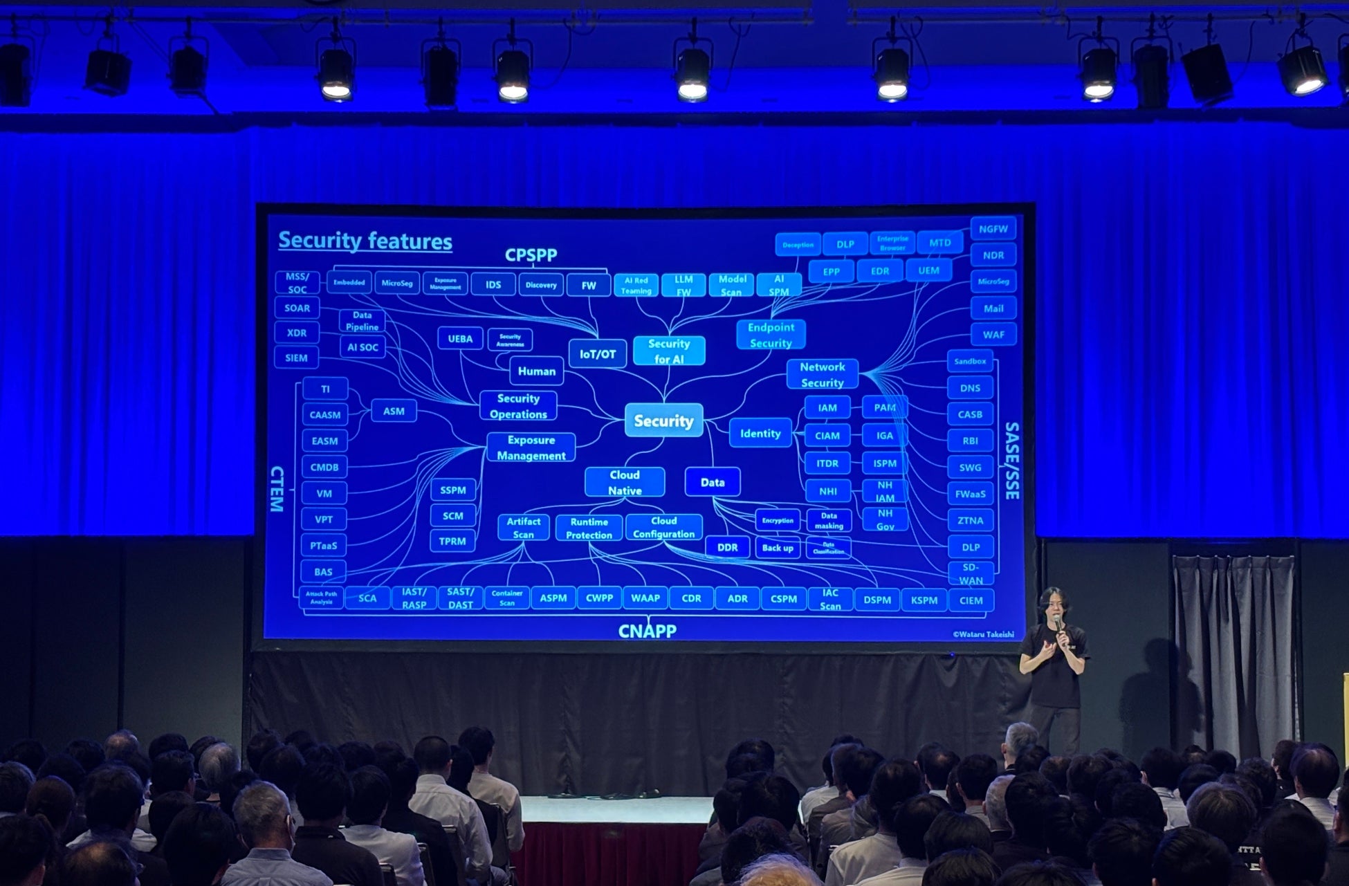 6月13日に行われた基調講演では、ネットワーク&セキュリティ推進本部 販売推進統括部 ゼロトラスト推進室長の竹石 渡が登壇し、毎年米国で開催される世界的なサイバーセキュリティイベント「RSAカンファレンス」で得た最新情報をもとに、国内で今後注目される可能性のあるキーワードやトレンドについて解説しました。聴講者数は700人を超え、サテライト会場での同時放映も行われました。